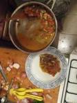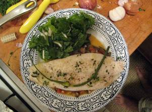 All should be ready to plate. Take the fish out and it will cool a tad while you prepare the plates with everything else. Scoop a nice bed of ragout onto both plates for the filet to fit nicely on. Put a healthy portion of the spinach salad that is already dressed onto each plate. Add the filet’s on the bed of ragout and voila!