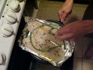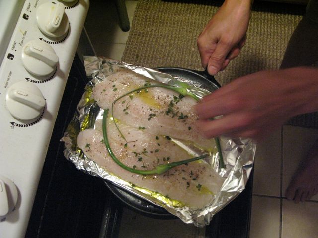 Set oven to broil. To prepare the 2 fillets, place them in whatever you’re going to broil them in. Pour a couple of tablespoons of olive oil over each filet. Sprinkle thyme leaves, salt, pepper and some fresh lemon juice over the top of each fillet. Cut two garlic scapes in half. Place the half with the bulb because it’s pretty. Set the fish aside.