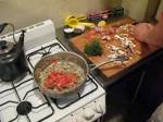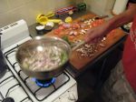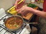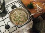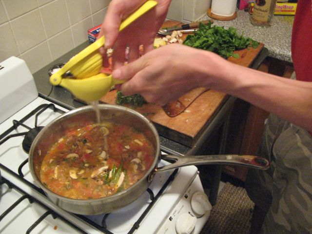 Now the sauce should be at a nice simmer. Stir often. If you have booze in the house, you can add a bit of white wine or a couple of dashes of Vodka. The alcohol will make the sauce taste like it’s been cooking for far longer than it has but that is absolutely optional. Cook the sauce a bit and then add mushrooms. Squeeze ½ a lemon in and cook the sauce down.