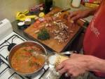 Stir the garlic scapes with a wooden spoon so they don’t burn or stick to the bottom of the pan. Cook them until they tenderize – about two minutes You can tell when they’re done when they begin to change color. Add the diced shallots and keep stirring. Add a bit of thyme. Add the roma tomatoes and continue to periodically stir the ragout.
