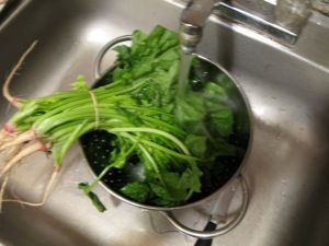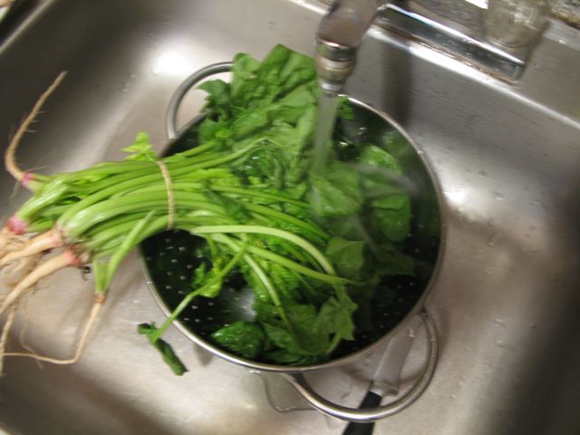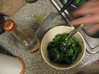 As the sauce is simmering away, let’s make the easy and delicious spinach salad. Wash the spinach.
