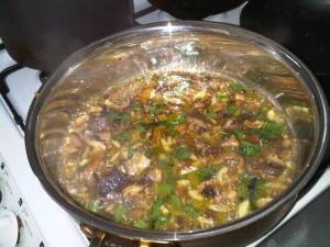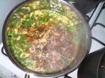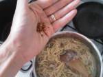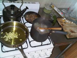 Reconstitute the mushrooms by simmering in a bit of water (or if you have some lead-time just let them soak. Do not through away the water the mushrooms are soaking in as because the water harbors the boldness of the mushrooms after reconstitution. Also if the mushrooms are larger trumpet or another type of larger mushroom, dice them somewhat–but not too small.
