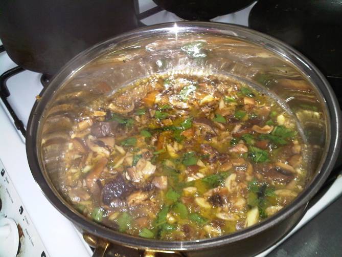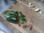 Put olive oil in the pan and lightly brown garlic. Be careful not to burn the garlic. Toss in the sage and a bit after that throw in the mushrooms along with their water.