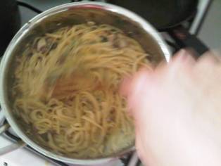 Take your al dente linguini and add to pan and quickly hit the pan with a bit of half n half and stir.