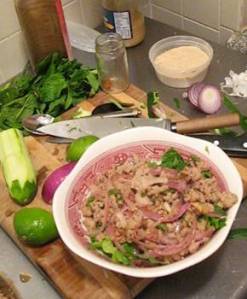 Larb is basically a salad with tasty spiced up ground meat (traditionally pork) on top. Yesterday I had ground turkey available so I used it. It is an excellent substitution for the pork, though I am partial to the traditional style.