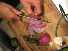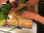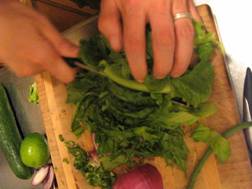Next put the peanut oil in a frying pan or wok let the oil heat up and add the garlic and sauté for a tad. (Here’s when you would add the sliced lemongrass if you had it. Add the turkey and brown the meat. Pork tends to have a higher fat content then turkey so the fat renders out and kind of crisps the meat a bit. To get that with turkey you need to make sure you have enough oil in the pan to do the job. After the meat has browned toss in the chilies (or red pepper to taste), salt, black pepper, onions, chopped garlic scape, fish sauce, juice from half of the lime and lastly the rice powder. Stir to combine the ingredients and slightly cook the onions and scapes (you want them to still have texture so be Quick!)