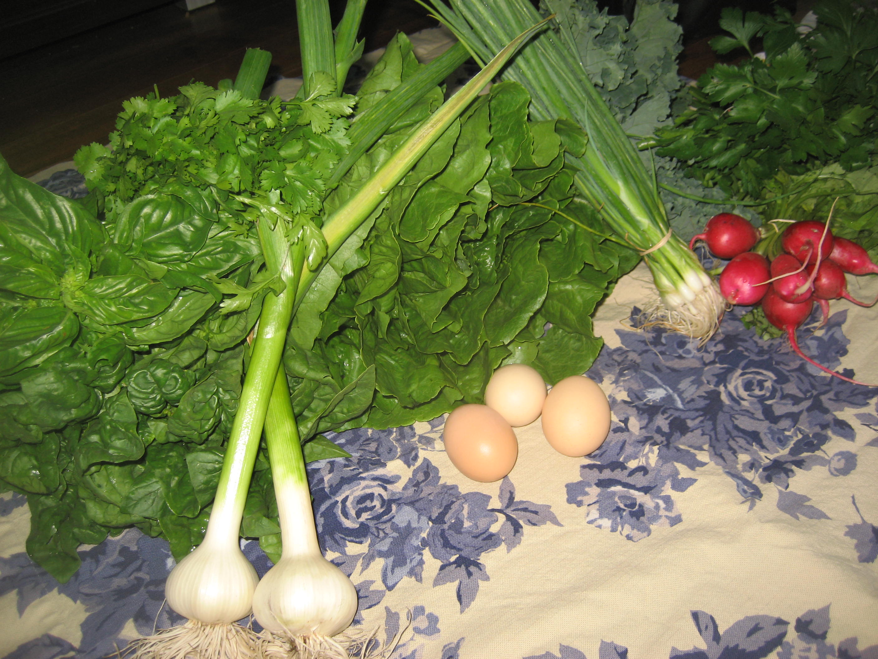 Week #2 MimoMex Veggie Share: Basil. Parsley. Cilantro. Radish. Romaine. Spinach. Kale. Garlic. Green Onions. 1 dozen eggs