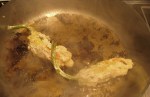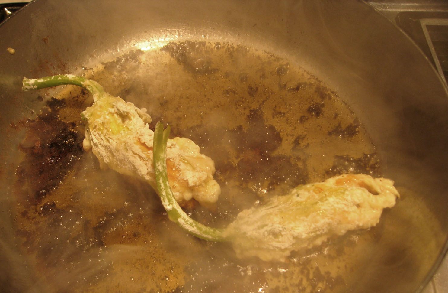 Put a liberal amount of vegetable oil in a frying pan (perhaps 1/2 inch high) and heat to medium-hot temperature. The hotter the oil the quicker the blossoms will fry. You want them to fry quickly so the cheese is sealed in but not too hot to burn the blossoms. Pay attention – if the flower & egg becomes burnt in the pan, then replace the oil and heat not quite so much. It’s an experimentation thing.