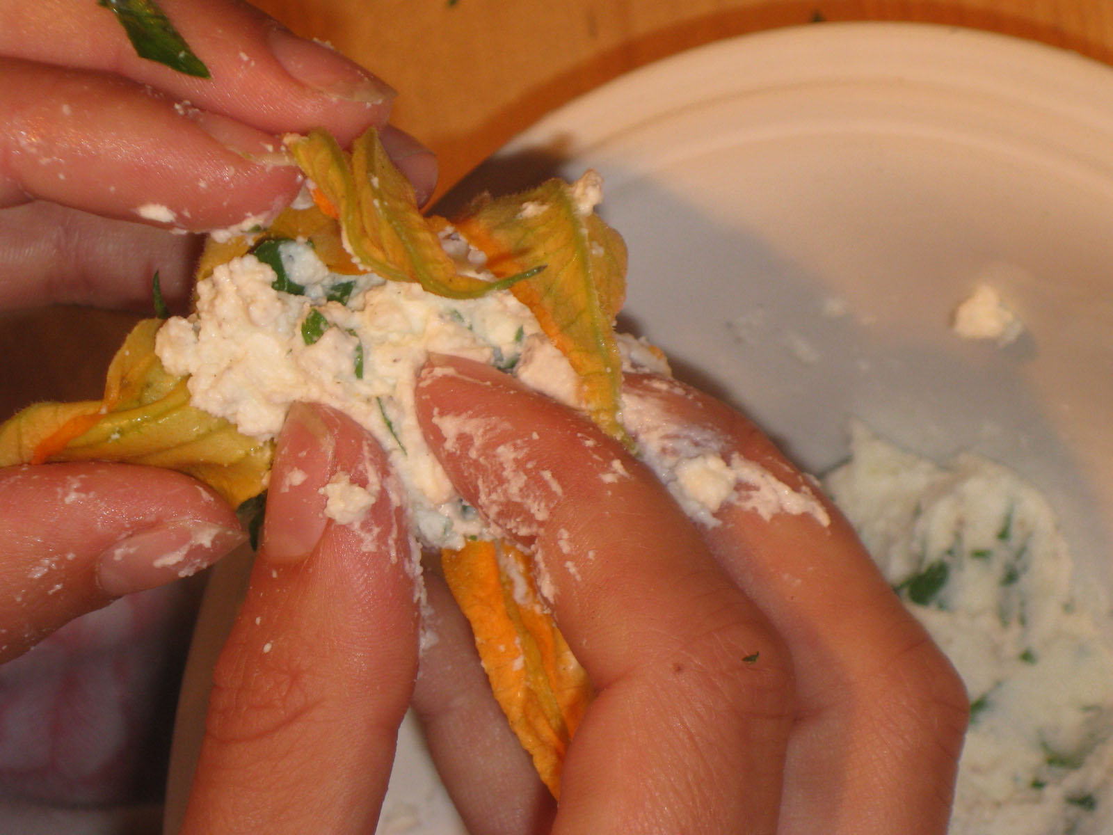 Gently pry open a zucchini blossom and stuff about 1/2 teaspoon of ricotta mixture into the middle, down as far as it will go. Don’t over stuff – it’ll come oozing out when fried.