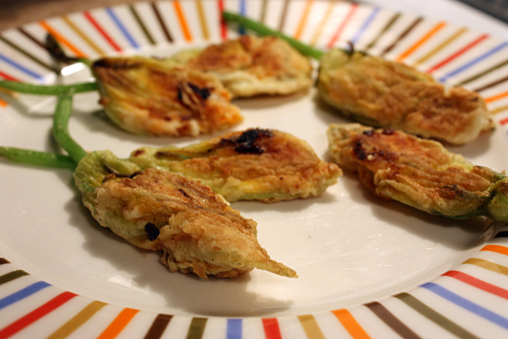 - I fried the blossoms in a very shallow amount of olive oil (just enough to coat the pan) until they turned golden brown, turning them several times.