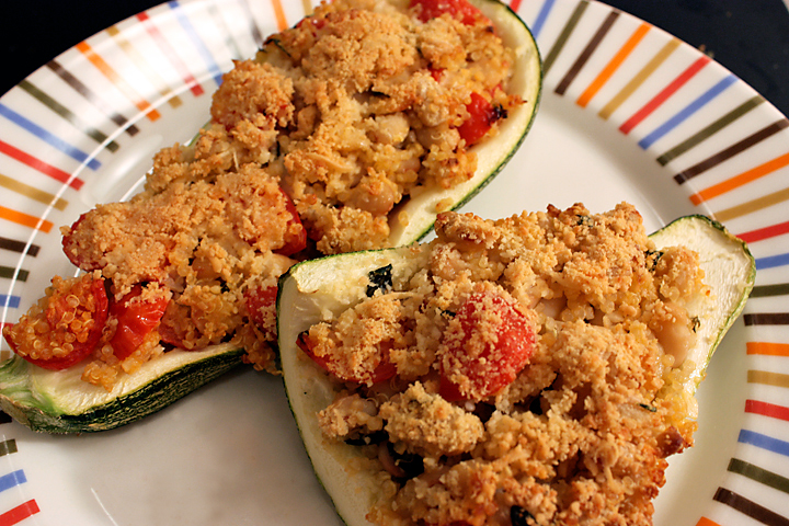 The original recipe can be found here (Zucchini w/ Quinoa Stuffing), but I tweaked it a bit by excluding the almonds and adding fresh oregano from this week’s share.