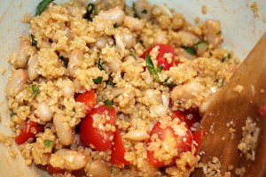3] Fluff the quinoa and fold in the beans, tomatoes, almonds, garlic, ½ cup of the Parmesan, and 3 tablespoons of the oil.