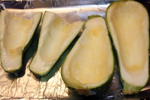 2] Meanwhile, cut the zucchini in half lengthwise and scoop out the seeds. Arrange in a large baking dish, cut-side up.