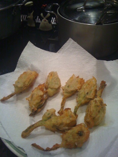 - In frying pan fill with vegetable oil about 3/4 inch. Get hot. Gently put flowers with tongs into oil..3 at a time so temp stays hot. Be careful of mad splatterin oil! When nice and golden, flip and do other side.