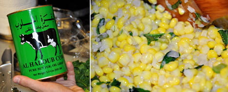 ***A note about Ghee: We discovered Ghee last summer at Sahadis on Atlantic Ave, and our life changed. Ghee is the middle eastern version of lard, and like most things obscure and hard to find, it blows the alternatives to shame. Ghee, also known as clarified butter in anglophone countries, is made by simmering unsalted butter in a cooking vessel until all water has boiled off and the milk solids, or protein, have settled to the bottom. The cooked and clarified butter is then spooned off to avoid disturbing the milk solids on the bottom of the pan. Unlike butter, ghee can be stored for extended periods without refrigeration, provided it is kept in an airtight container to prevent oxidation and remains moisture-free. Texture, color or taste of ghee depends on the source of the milk from which the butter was made and the extent of boiling. Further, the smoke point is far higher than most commonly used vegetable oils.