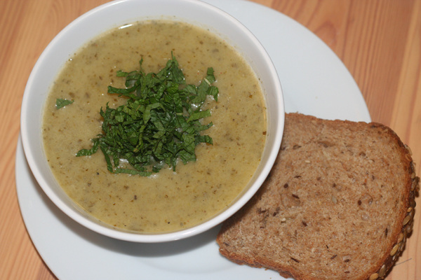 My apartment is hot. We don’t have air-conditioning, and live on the top floor of a brownstone – so my boyfriend and I have been suffering through the past few weeks. This means that generally, we favor meals that are cold. I was looking for something to do with the celery and came across a cold celery soup recipe that seemed perfect… Only had to change a few things to make it dairy-free and voila – yummy soup!