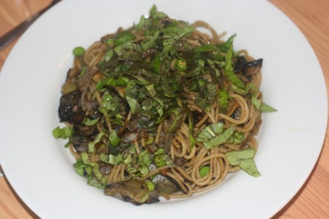 Drain spaghetti and rinse in cold water. Let excess water run off and dump spaghetti into pan with veggies. Toss everything together – add a couple more tablespoons of oil and season as desired. As you turn off the heat, mix in a handful of chopped basil and serve!