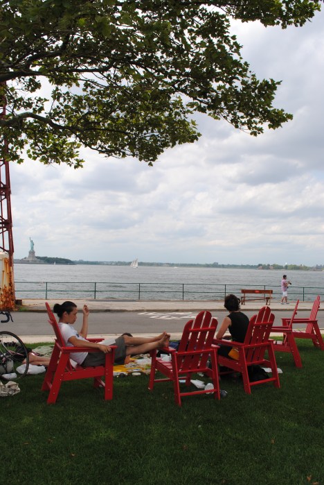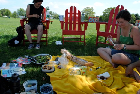 The best part of our day came with our picnic lunch. Picnic Point is one of the supreme picnic spots in the city and our CSA produce rocked some seriously yummy picnic fare. Blueberry muffins, homemade jams, green salads, veg sandwiches, and more. With bike paths, good books, great conversations, and musical fun, it took a torrential downpour to drive us off the island. Be sure to check out the good times to be had at Governors Island for yourself! Super big thanks to Alyssa for organizing such a great community event!