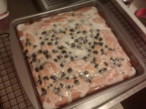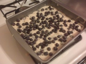 Since being married, I’ve taken it upon myself to learn to cook (or at least try). My mom gave me a copy of the super-groovy 1970s edition of the Betty Crocker Cookbook for a wedding gift, mostly because it has all of the recipes she would make when my brother and I were kids. And who doesn’t love a good taste of nostalgia? She used to make this blueberry coffee cake that was so amazing, it wouldn’t last a day in our house. She would only make it when guests were coming over, and even then she’d designate a certain section for my brother and I, because she knew we would eat the whole thing if given the chance. So now that I have the recipe and a freezer-full of blueberries, let’s see if the recipe holds up.