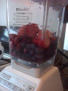 I’ve taken to blending the frozen blueberries, along with fresh strawberries and raspberries in our blender for a very happy juice. Take about 1c blueberries, about 5 strawberries, and a handful of raspberries or blackberries (whatever we have that week). Then drizzle in some honey and add about 1/3c water (otherwise it’s less juice and more sludge).