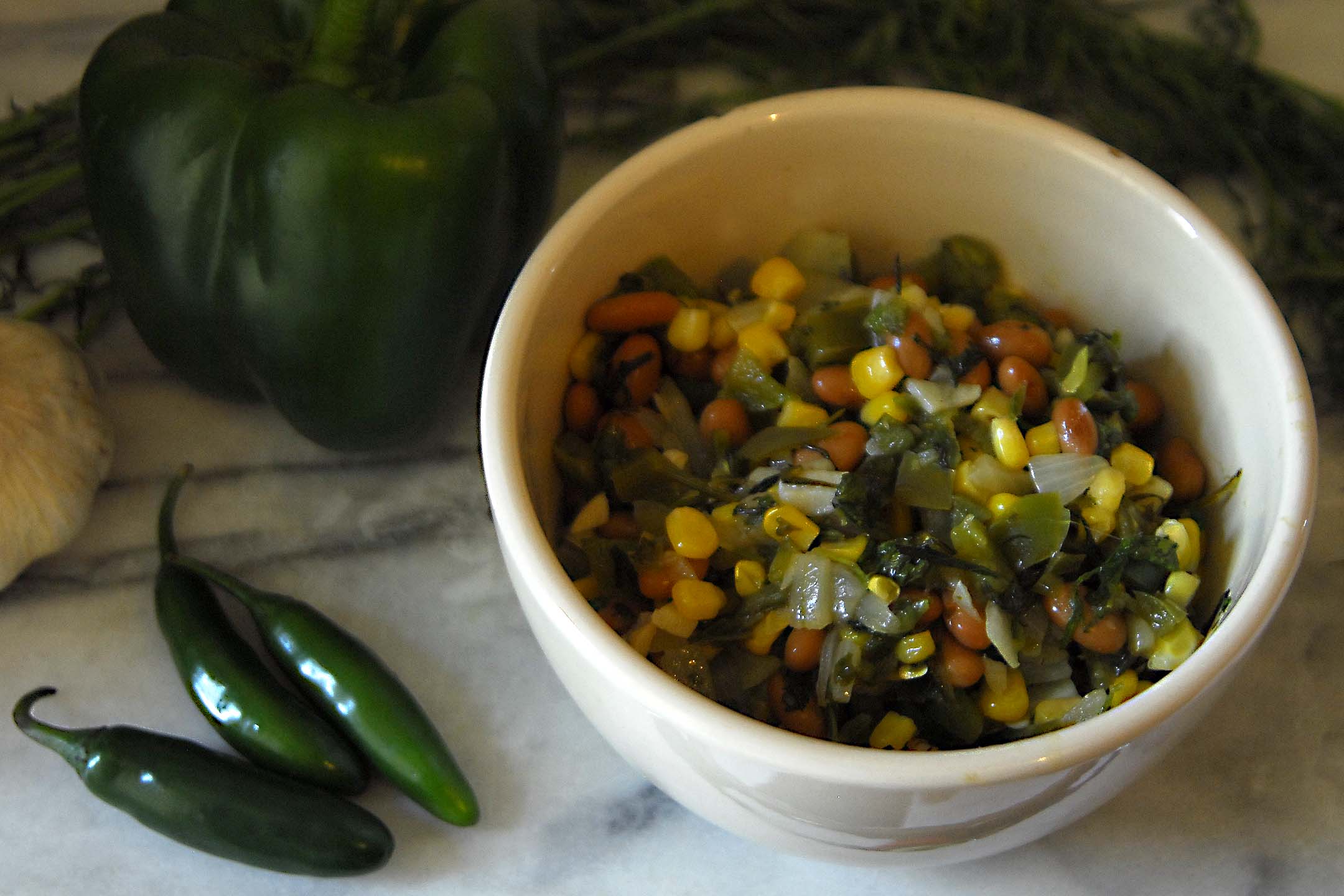 Instructions: In a large heavy saucepan, heat oil over medium heat. Sauté the onion for 3 to 4 minutes, or until softened. Add the peppers and cook for 2 minutes more, stirring occasionally. Stir in the corn kernels, beans, epazote, water, and salt. Reduce the heat to low, cover and cook for about 10 minutes, or until the corn is tender. Serve warm, sprinkled with the fresh epazote.