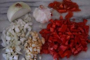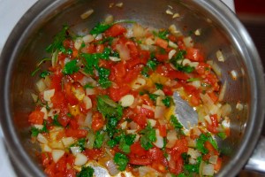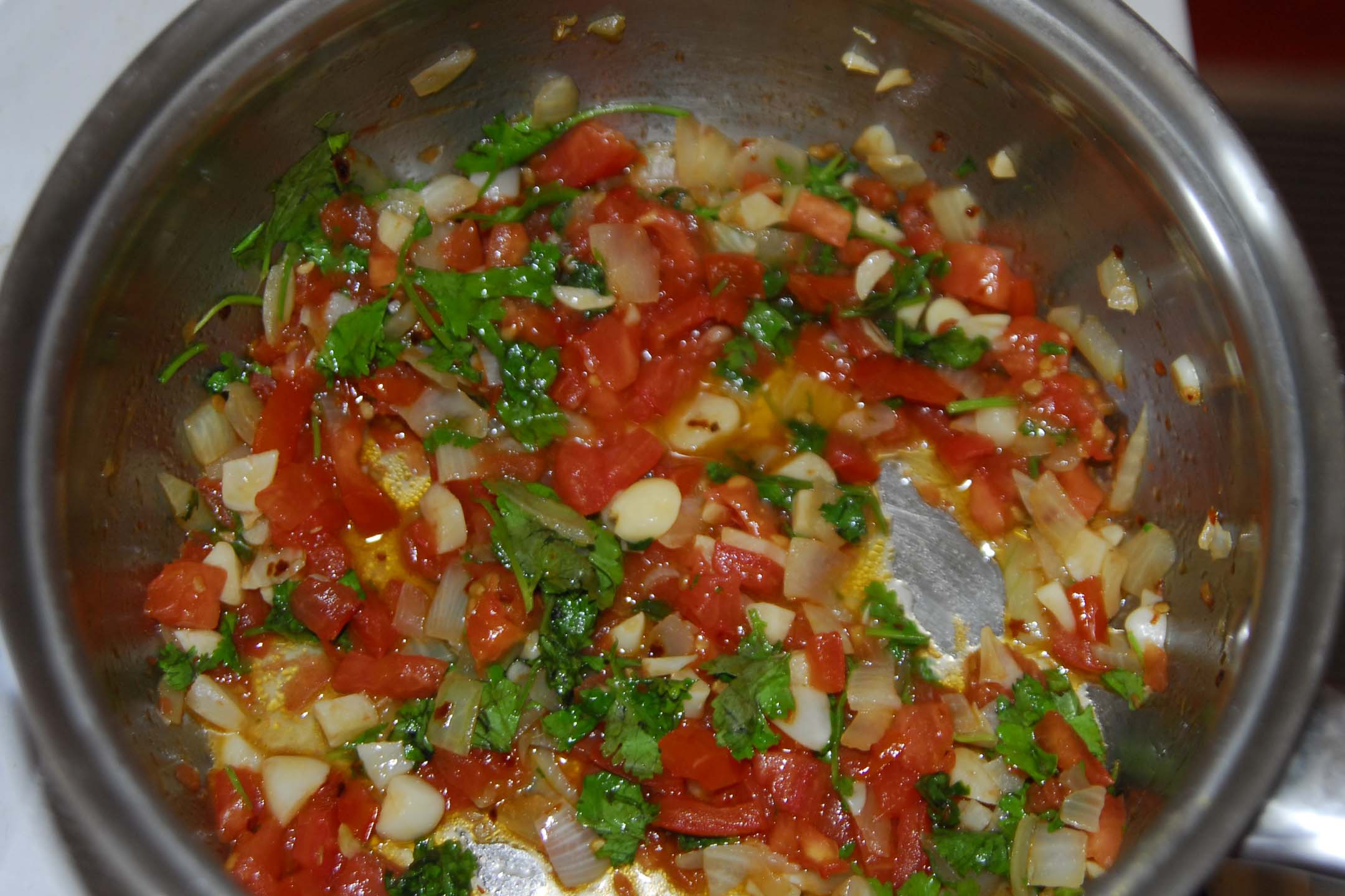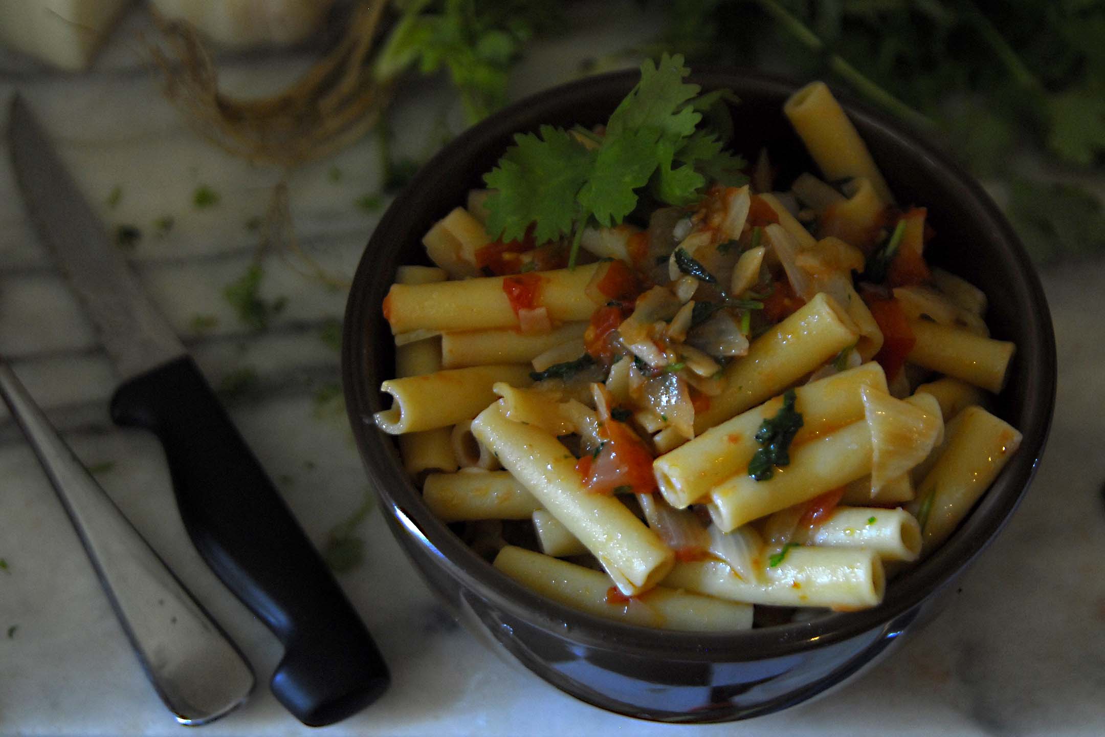 Boil pasta. Satay onion, garlic and peppers in a heavily oiled pan. Add cooked pasta, tomato, cilantro and salt to the pan.