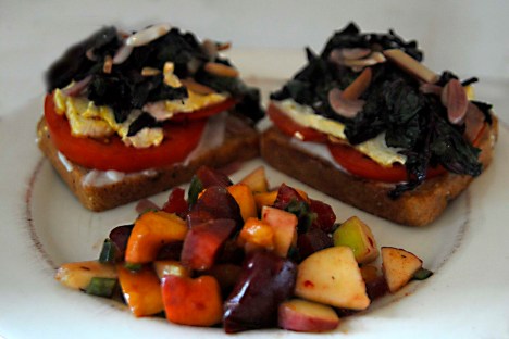 - Toast bread of your choice and then layer greens, tofu and tomato slices on top.