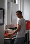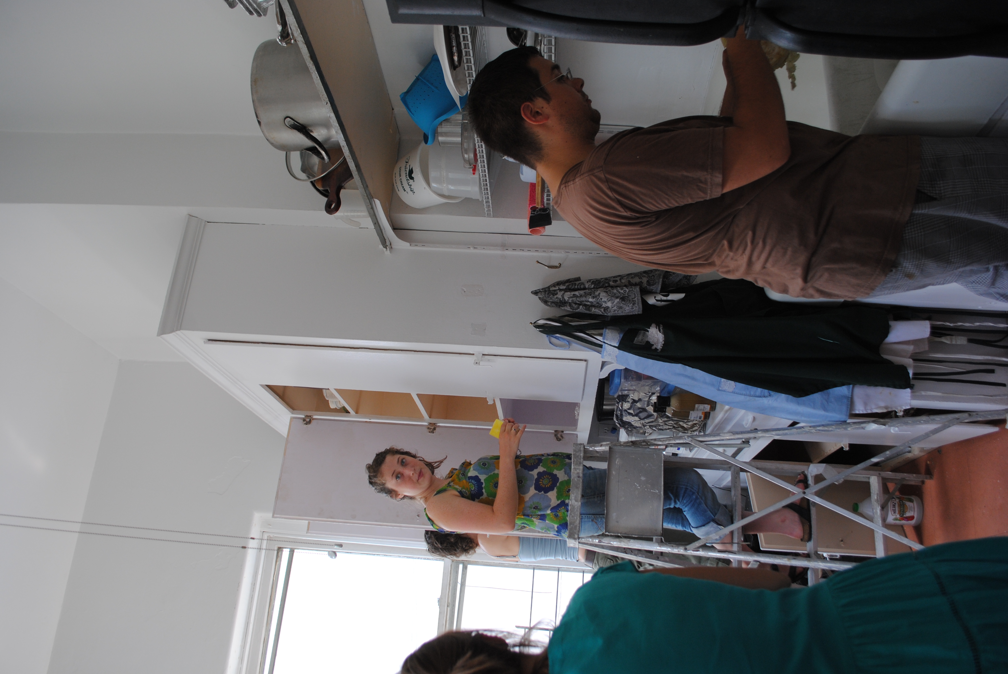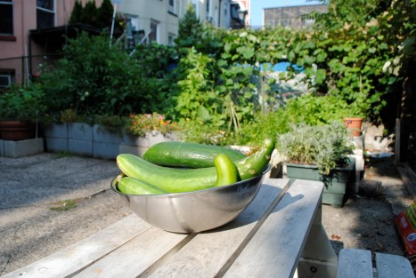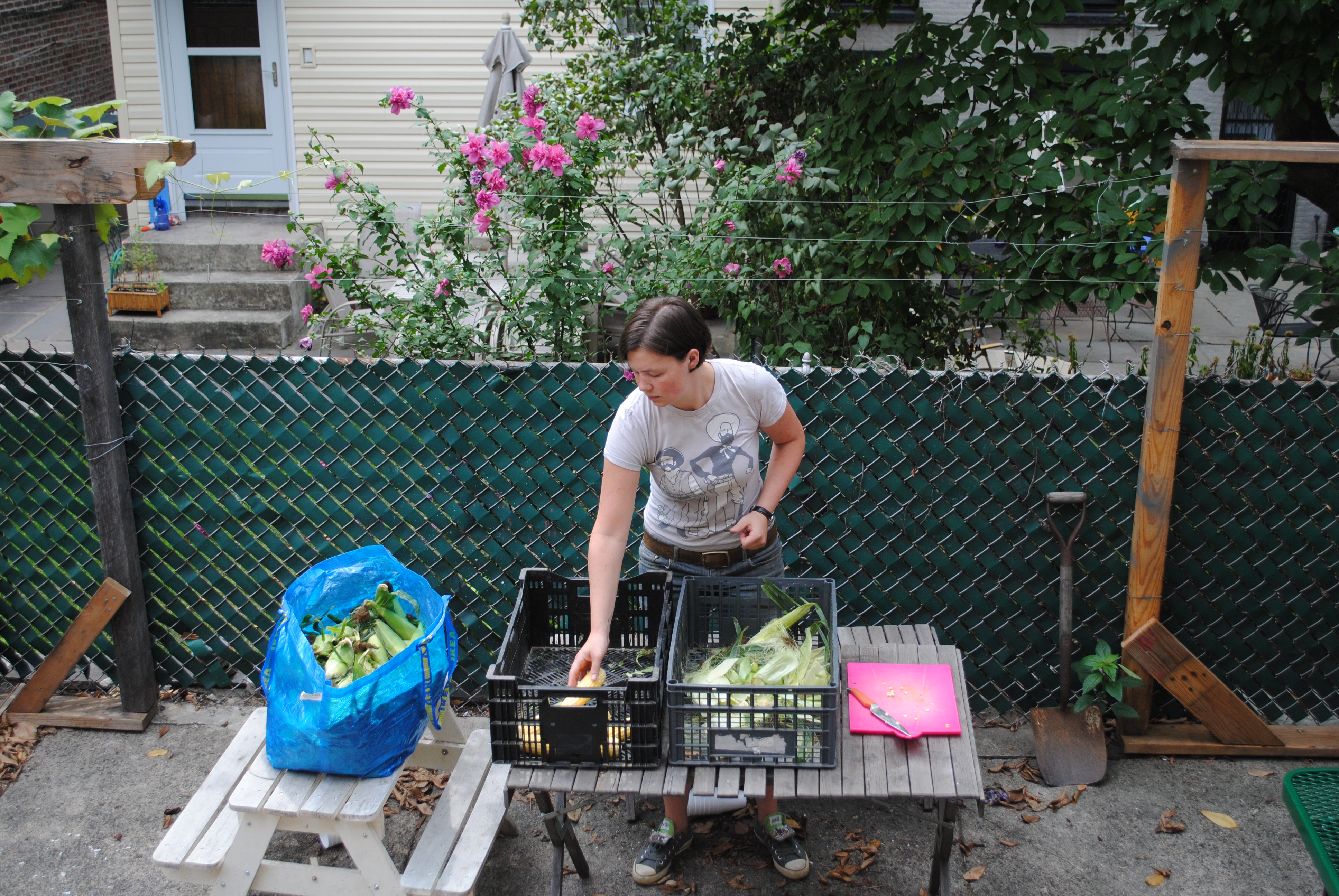 The goal during our saturday workshifts is to take the produce delivered from the Greenpoint-Williamsburg CSA and unload it, prepare it for storage, and plan for the upcoming meal. In the hot and humid weather during the CSA season, fruits and vegetables must be properly stored or they will rot. We also try and plan out the various dishes that will complement the main course, typically a meat-based event. If there is stuff that can be done for the meal, like making a tomato sauce or fruit compote, then vegetables are chopped and the oven gets humming. We have pickled cucumbers and beets while also watering and weeding the backyard kitchen garden.