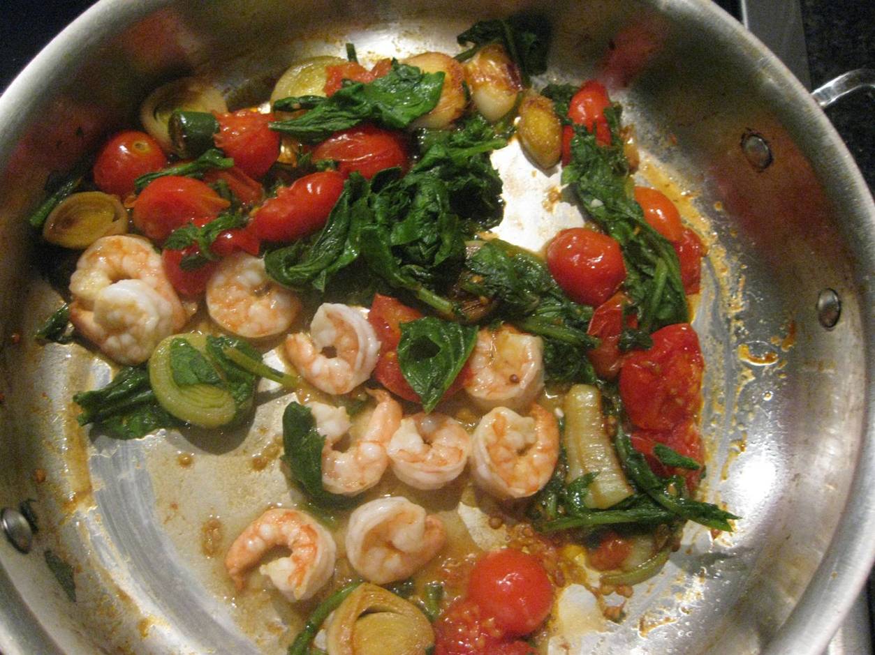 After pick up I realized all I had to add to the distribution for my meal was a bag of frozen shrimp (Whole Foods sells some excellent frozen shrimp), so I set about making a shrimp stir-fry: