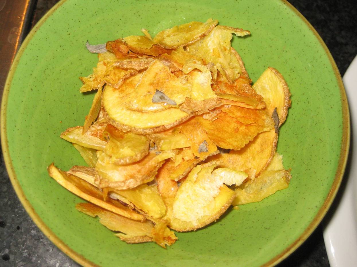 For the chips, simply sliced thin and sprinkled with salt, pepper, red chili flake, and chopped sage, and baked in pre-heated 400 degree oven for about 20mins, just until browned and crispy. I love this side dish!
