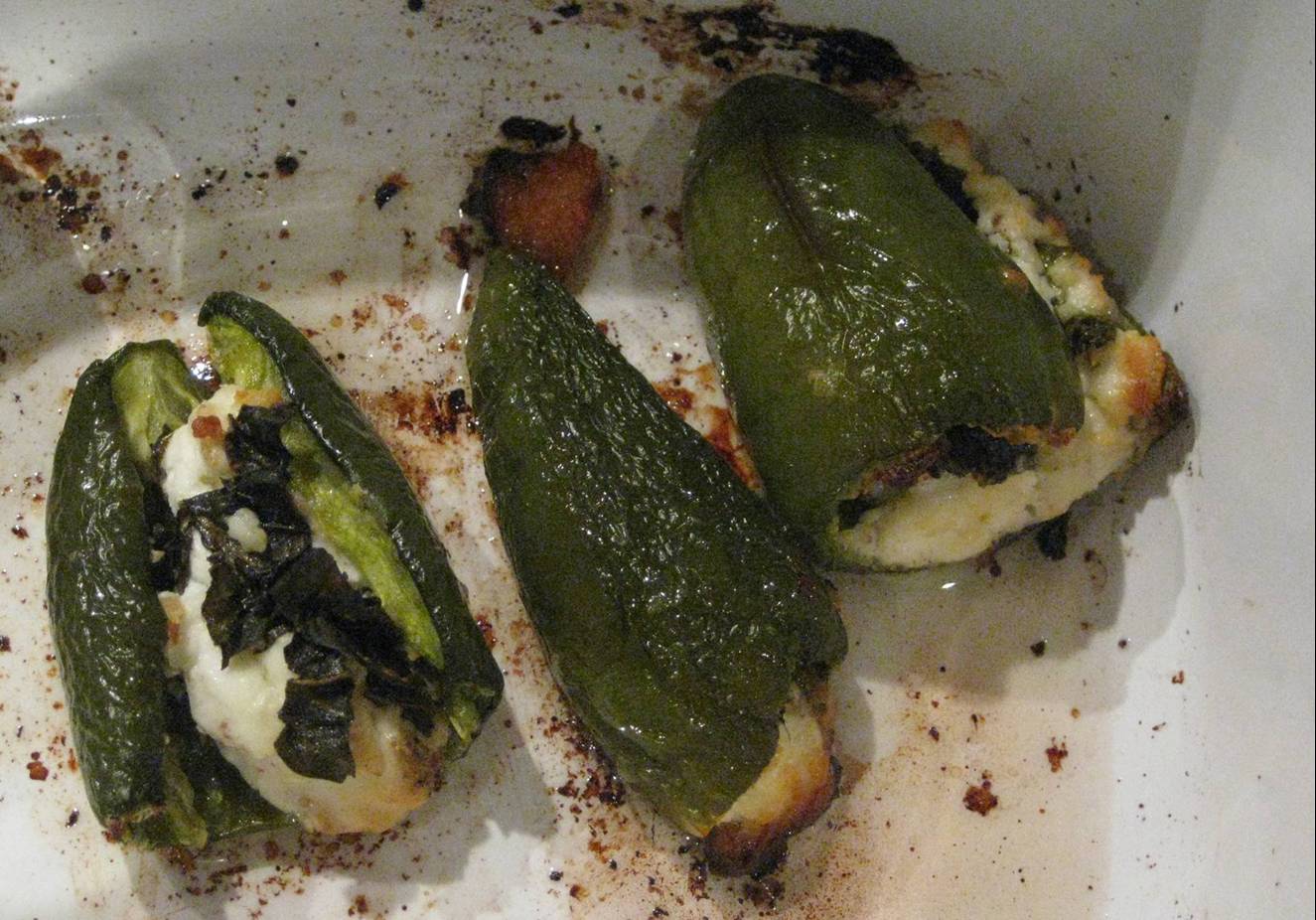 The poppers: I simply stuffed them with goat cheese mixed with the fresh basil, and made sure they had enough olive oil coating on them to get nice and soft and moist as they baked. I baked them for about 35mins in a 450 degree oven. I was afraid they’d be too spicy to eat, but when they cook that long in the oven they actually lose their heat, so they were perfectly edible! And very tasty.
