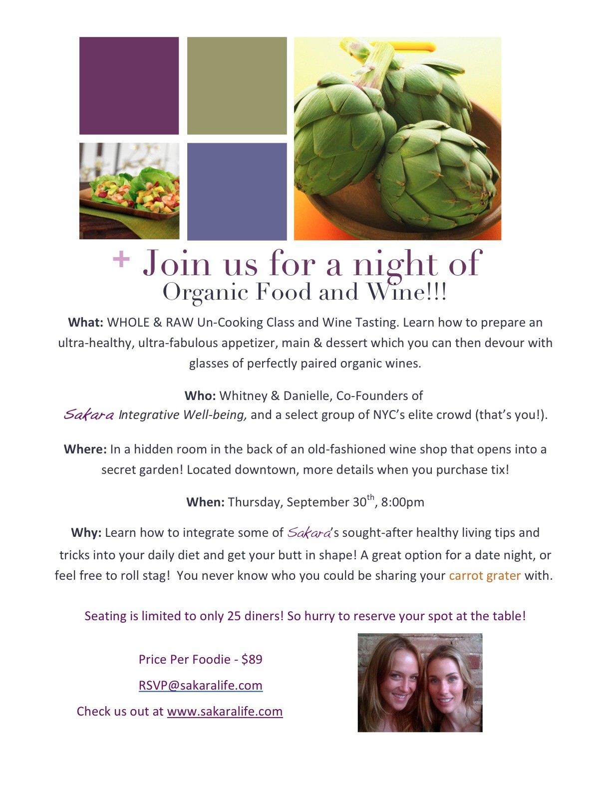 Join us Whitney and Danielle for an evening of wining, dining & veggie-crunching! Learn how to prepare a nutritious and oh, so delicious raw meal as you sip on some of our favorite ORGANIC wines… tempting, eh?