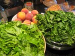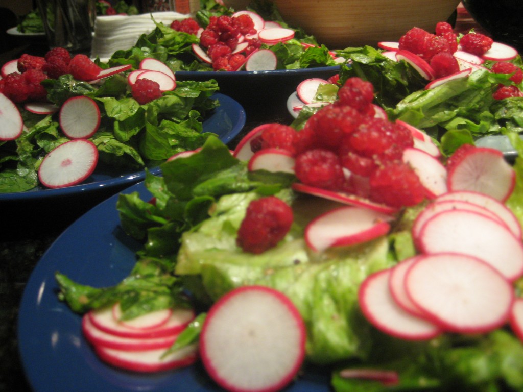Salad of thinly sliced radishes & fresh picked raspberries on a bed of romaine lettuce with a light vinaigrette