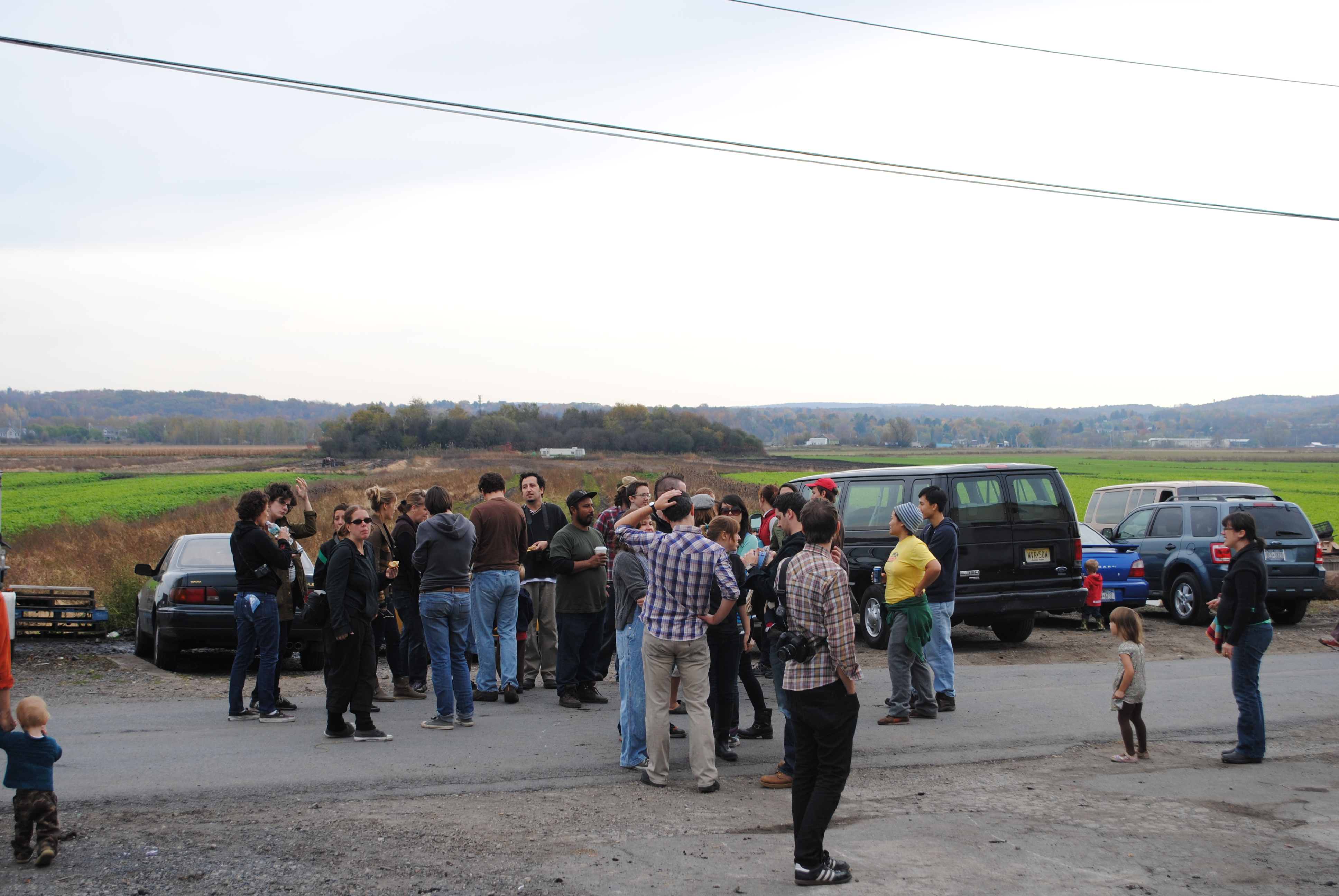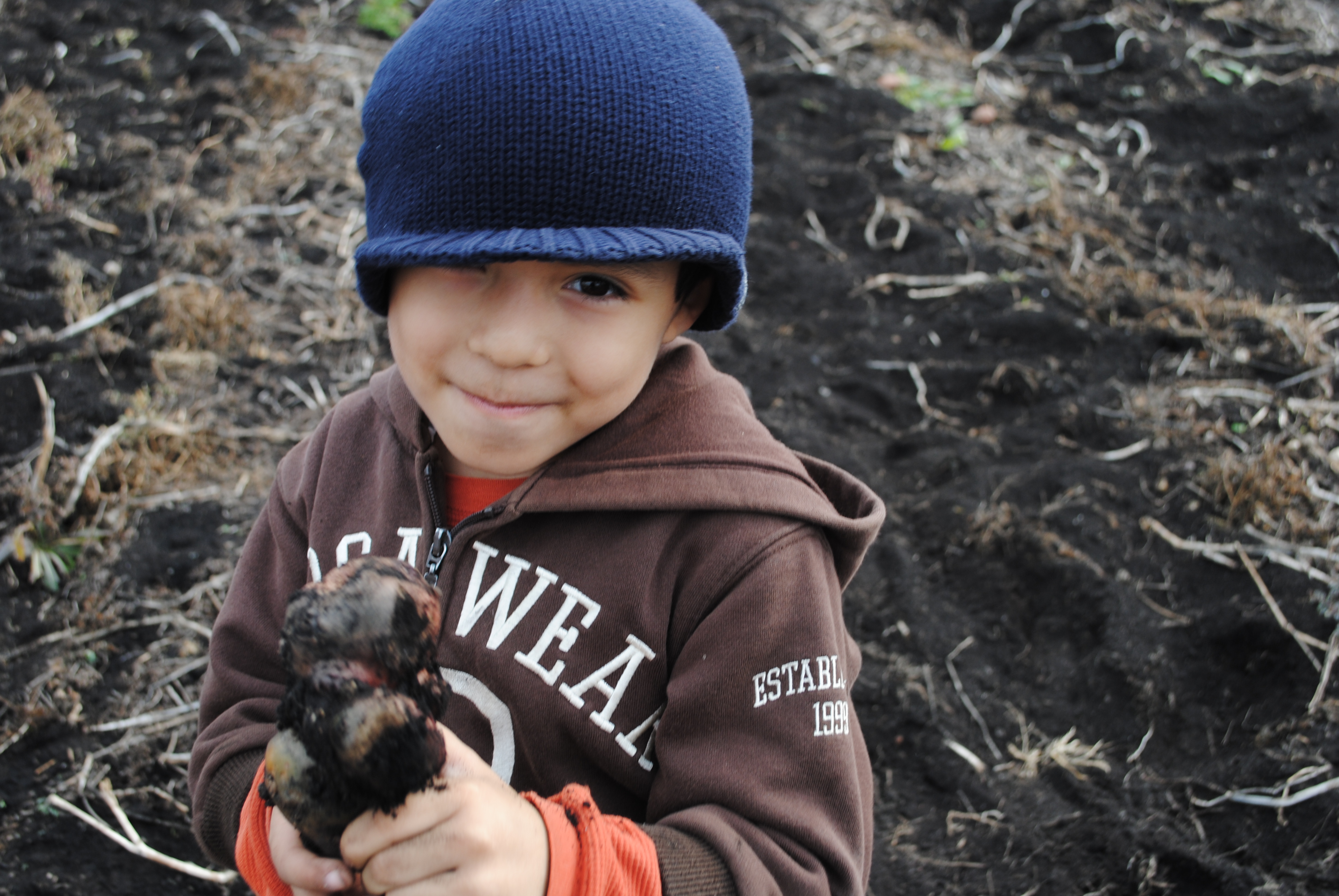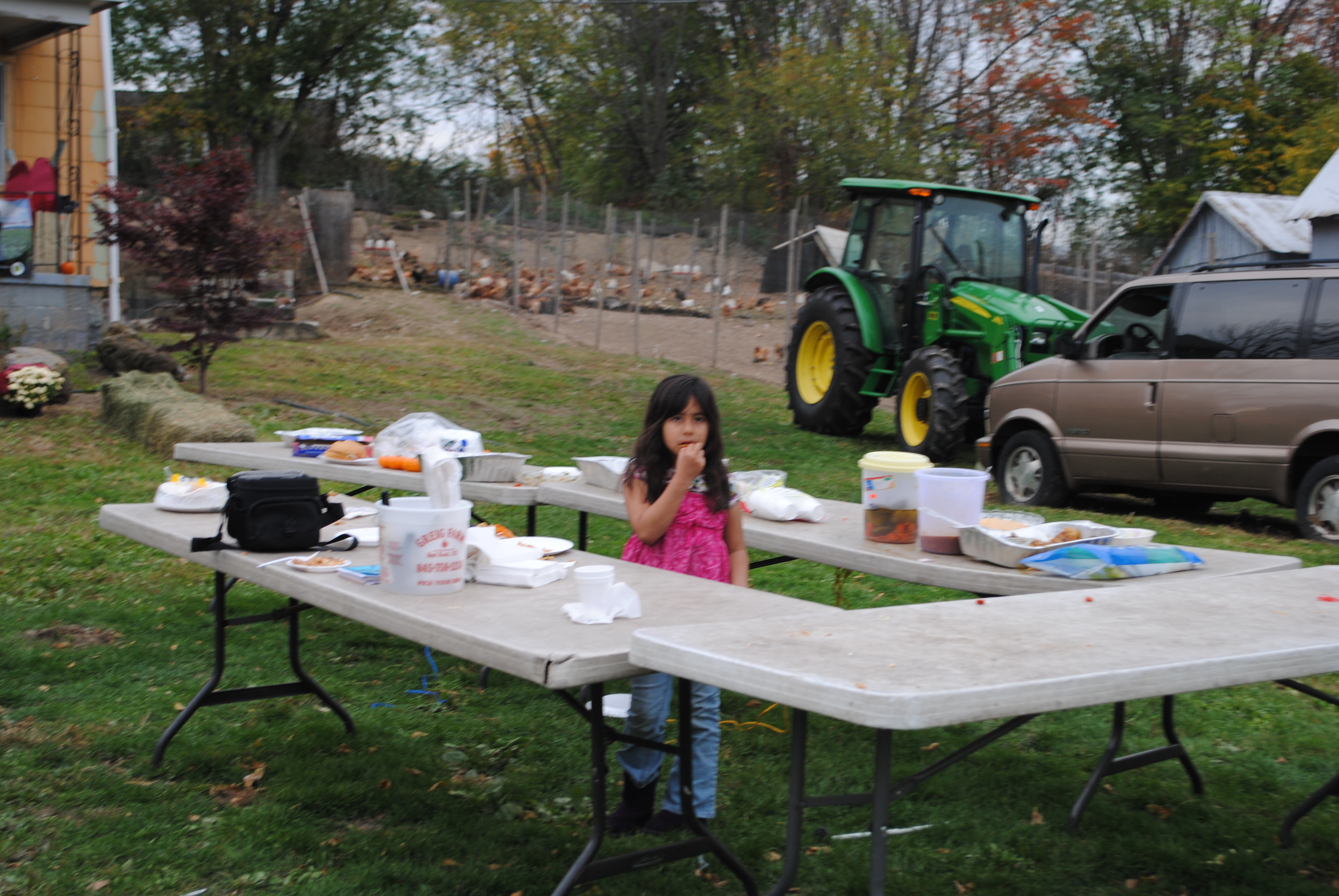 It was a nice, crisp Fall day out in Black Dirt country. About 50 of us gathered at the farm for a day in the country touring MimoMex Farm. We started the day with fresh pressed apple cider and apple pie. After knoshing, we checked out all the MimoMex fowl and then had a giant potluck lunch. Gaudencia rocked the kitchen, serving up tamales, beans, and guacamole that rocked the house. The rest of us brought some tasty treats made from our MimoMex shares. The result of which was a seriously yummy feast! After munching, we went out to the fields and harvested potatoes, carrots, and lemongrass.