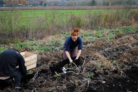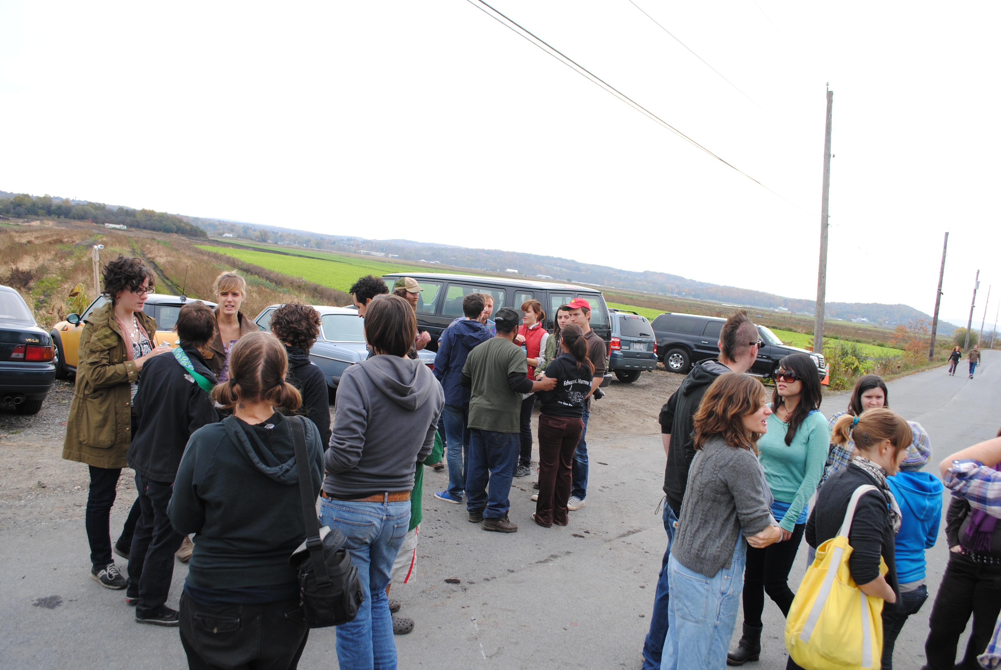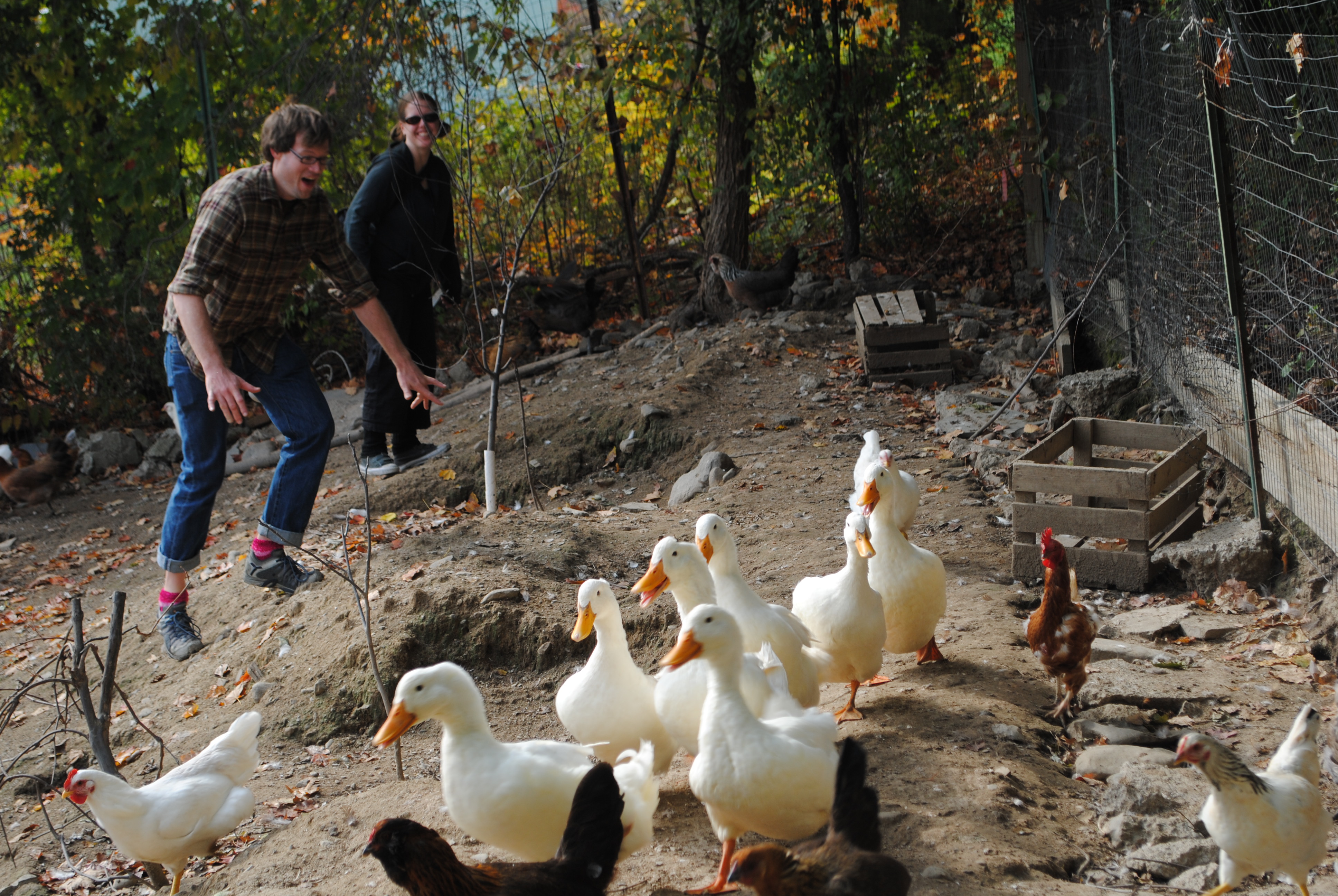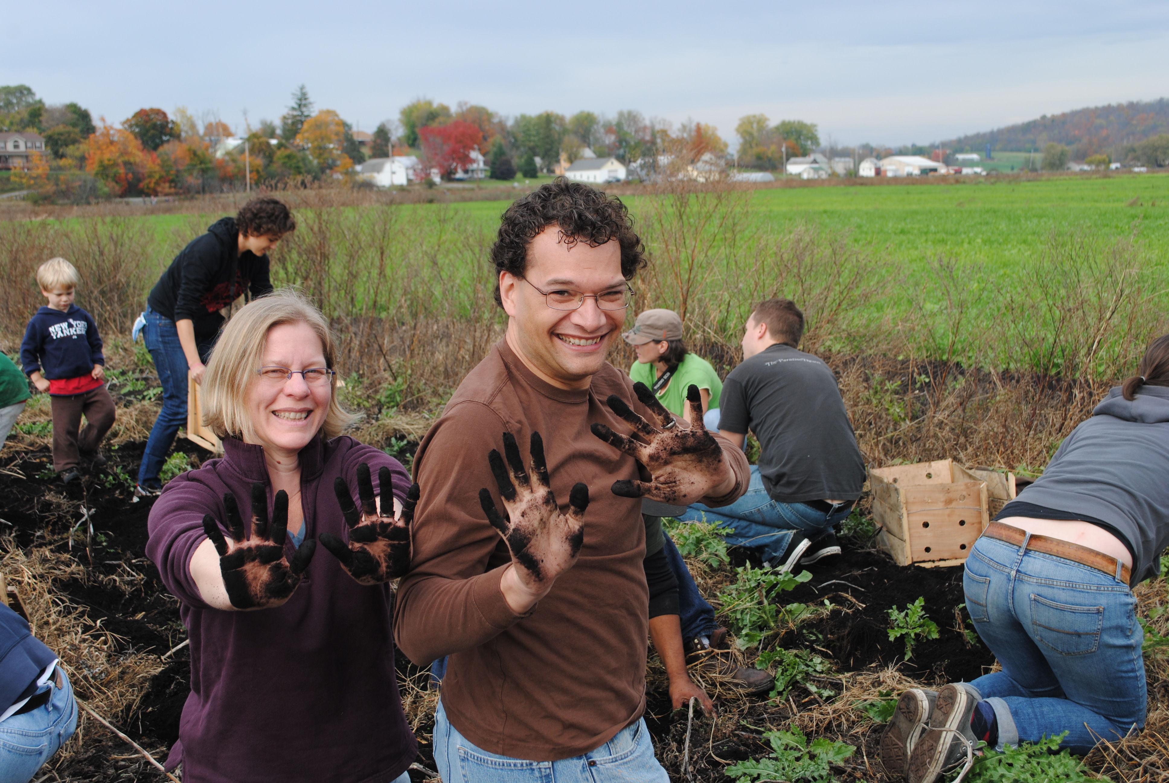 It was a nice, crisp Fall day out in Black Dirt country. About 50 of us gathered at the farm for a day in the country touring MimoMex Farm. We started the day with fresh pressed apple cider and apple pie. After knoshing, we checked out all the MimoMex fowl and then had a giant potluck lunch. Gaudencia rocked the kitchen, serving up tamales, beans, and guacamole that rocked the house. The rest of us brought some tasty treats made from our MimoMex shares. The result of which was a seriously yummy feast! After munching, we went out to the fields and harvested potatoes, carrots, and lemongrass.