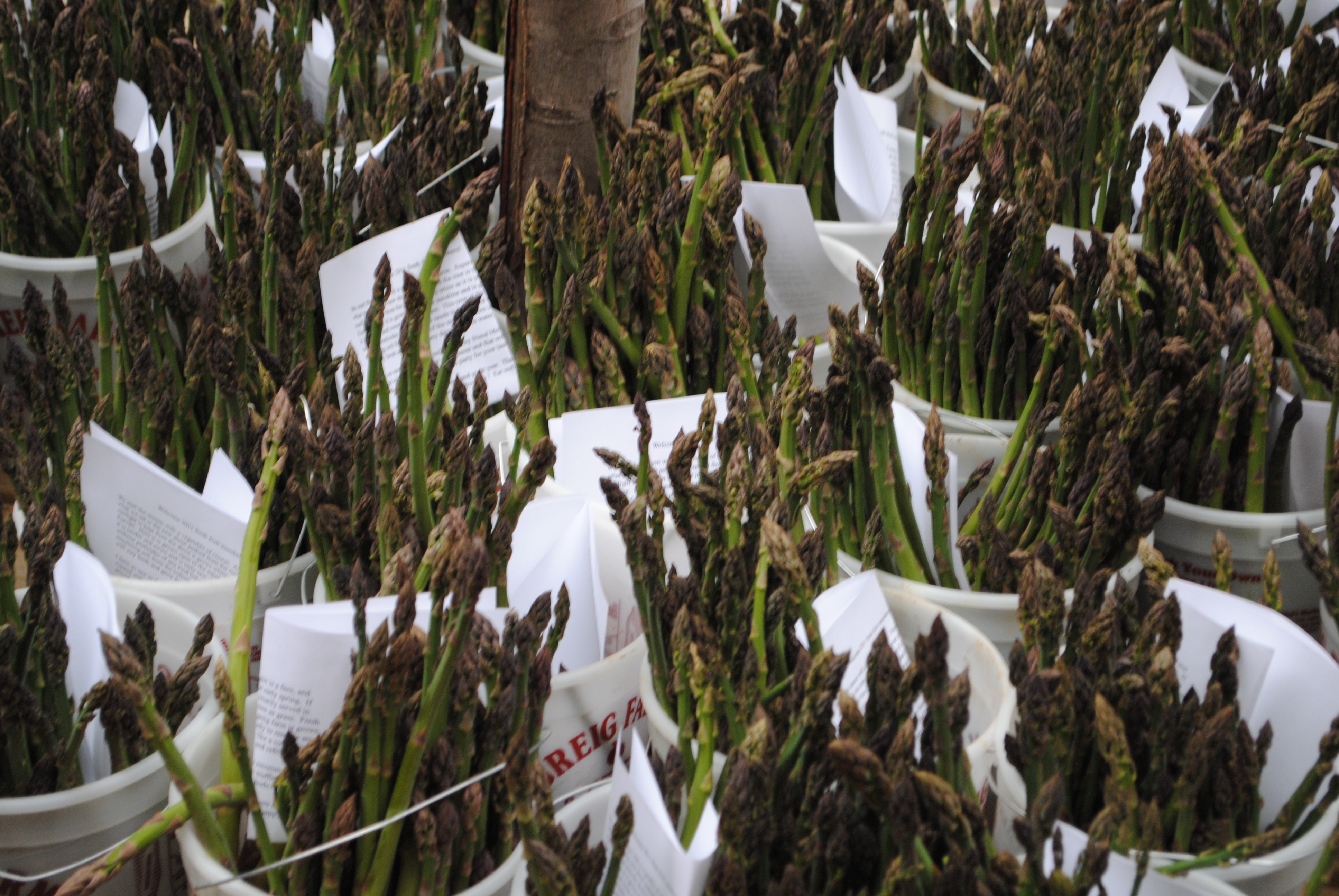 We start the season with a vegetable of course. Asparagus is a fern, and what we eat is the new shoot pushed from the root in the early spring. If sunlight is kept from the shoot, it grows white; as it is primarily served in Europe. Here it is grown open to the sunshine and is green as grass. Freshly harvestesd, it is tender and sweet and is tasty raw. This crop at the Greig Farm is grown without pesticides of any kind and only needs to be washed to remove any remaining soil from the bottom of the stalk. The fern is cut like a flower; it will stay fresh and grow for many days if kept in water, and refigerated.
