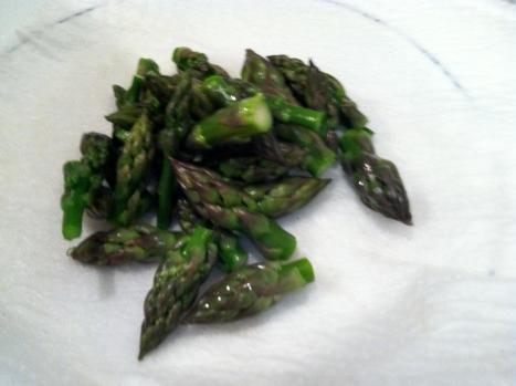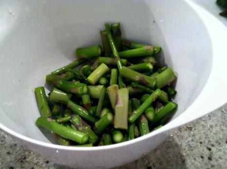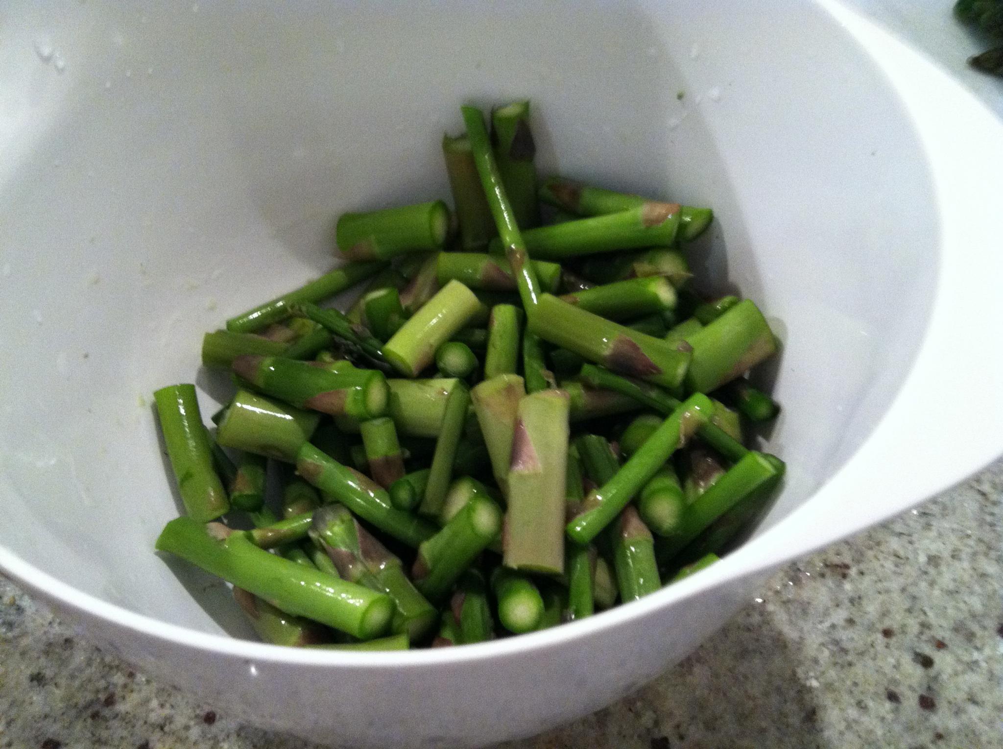 - Cut the asparagus into tips, middle sections, and woody stems and cut the middle section into inch-long slices.