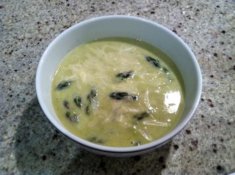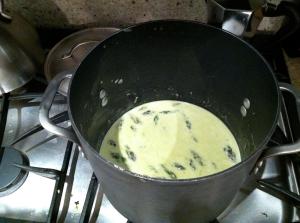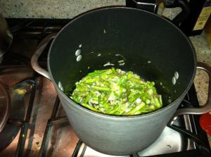 For the asparagus, since the weather was still a bit wintry, we decided to make soup. Along with the asparagus–probably a little more than a pound after the spears we ate raw–the recipe (swiped online) calls for: