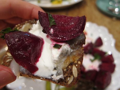 Hero Bite: Multiseed cracker spread with roasted garlic, a bit of goat cheese and roasted beets.