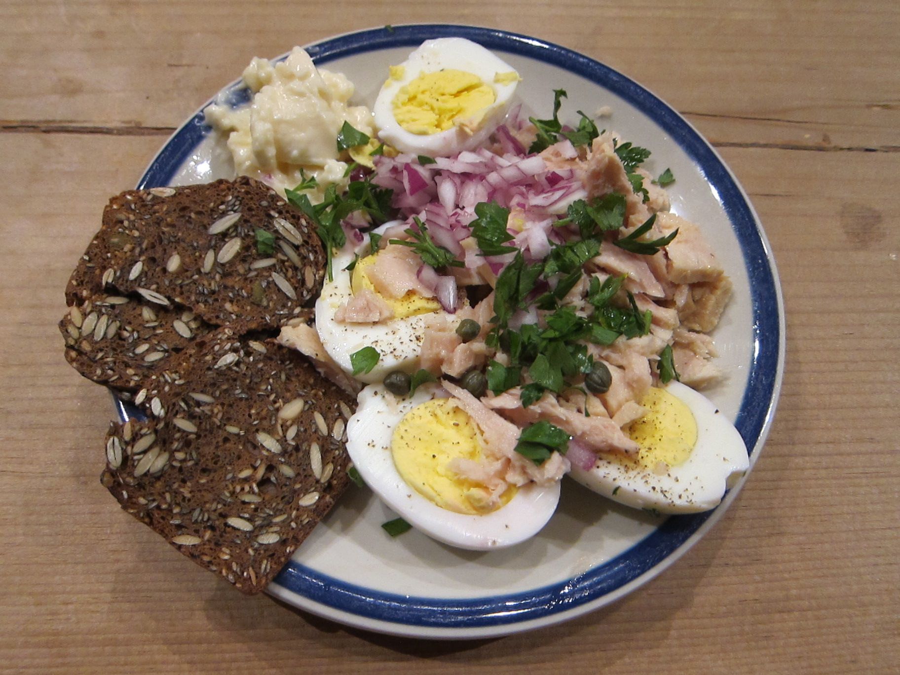 Deconstructed Tuna Salad- nice Italian tuna with capers, red onion, parsley, boiled eggs and some mayo on a cracker. Used: Eggs