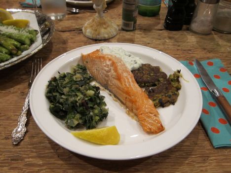 Here is a proper dinner I made for some friends in about an hour. I was inspired by sauteeing the swiss chard and leeks as a side dish and decided to pair it with roasted wild salmon, zucchini cakes, and a yogurt/sour cream- cucumber sauce with basil and chives. Used: Leeks, swiss chard and basil