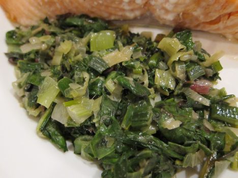 Sauteed leeks and swiss chard with a little butter, olive oil, salt and pepper. Used: Leeks and swiss chard