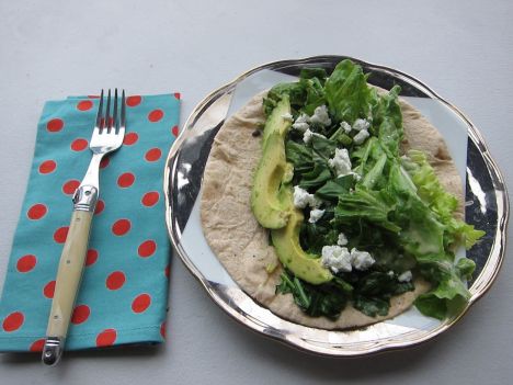 Good for any time of day- Green Taco. I sauteed scallions and spinach in olive oil with salt and pepper, added a bit of goat cheese, sliced avocado and some leftover salad with lemon-shallot dressing. Really nice and light. Used: Spinach and lettuce
