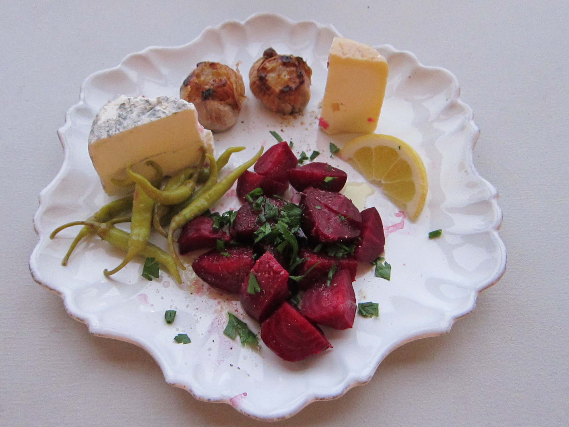 Antipasto Plate- I wanted to showcase the gorgeous beets so I roasted them and paired them with roasted garlic, two different kinds of goat cheese and some sweet piparra peppers. Used: Beets and garlic