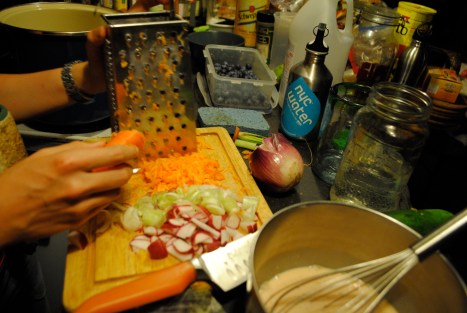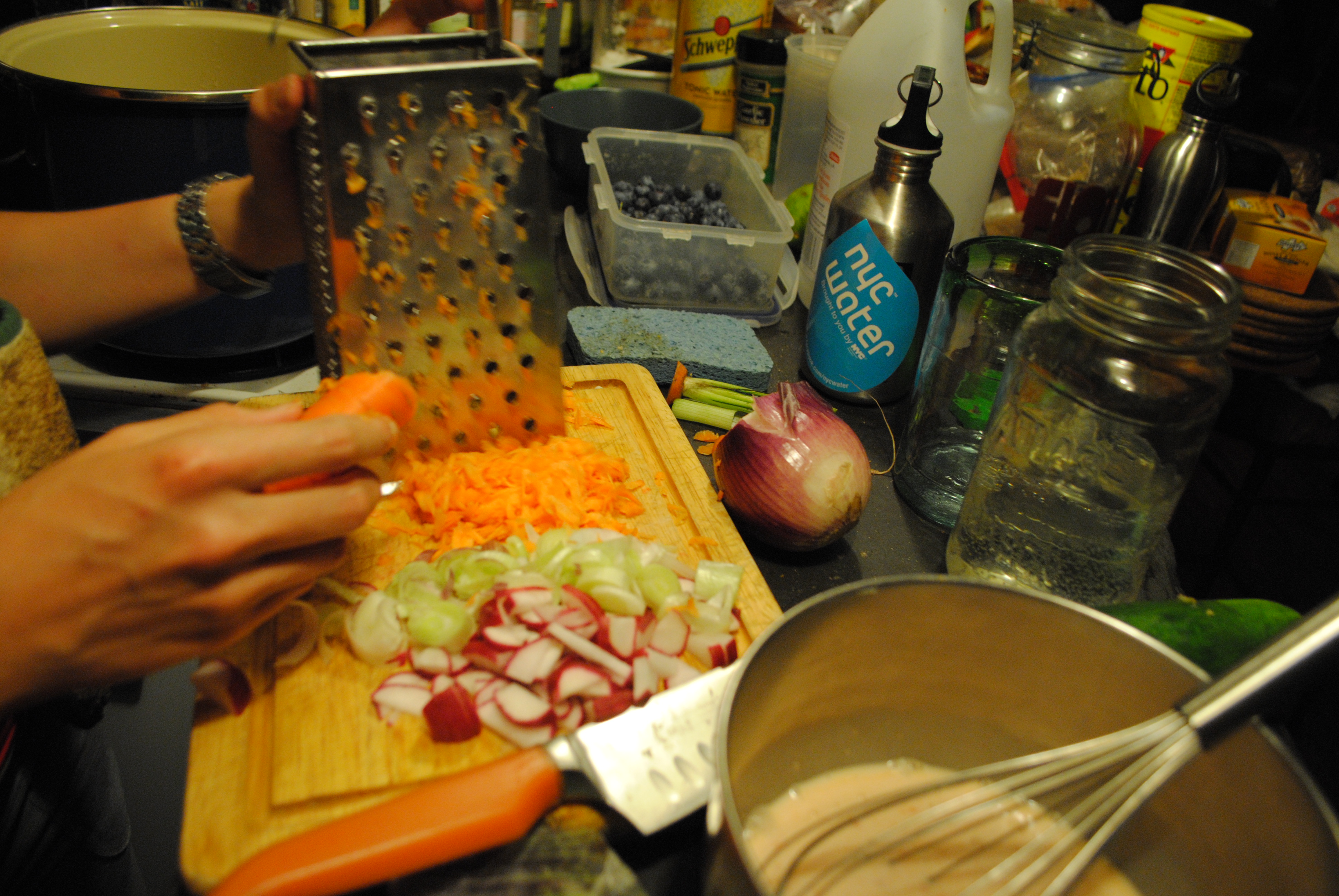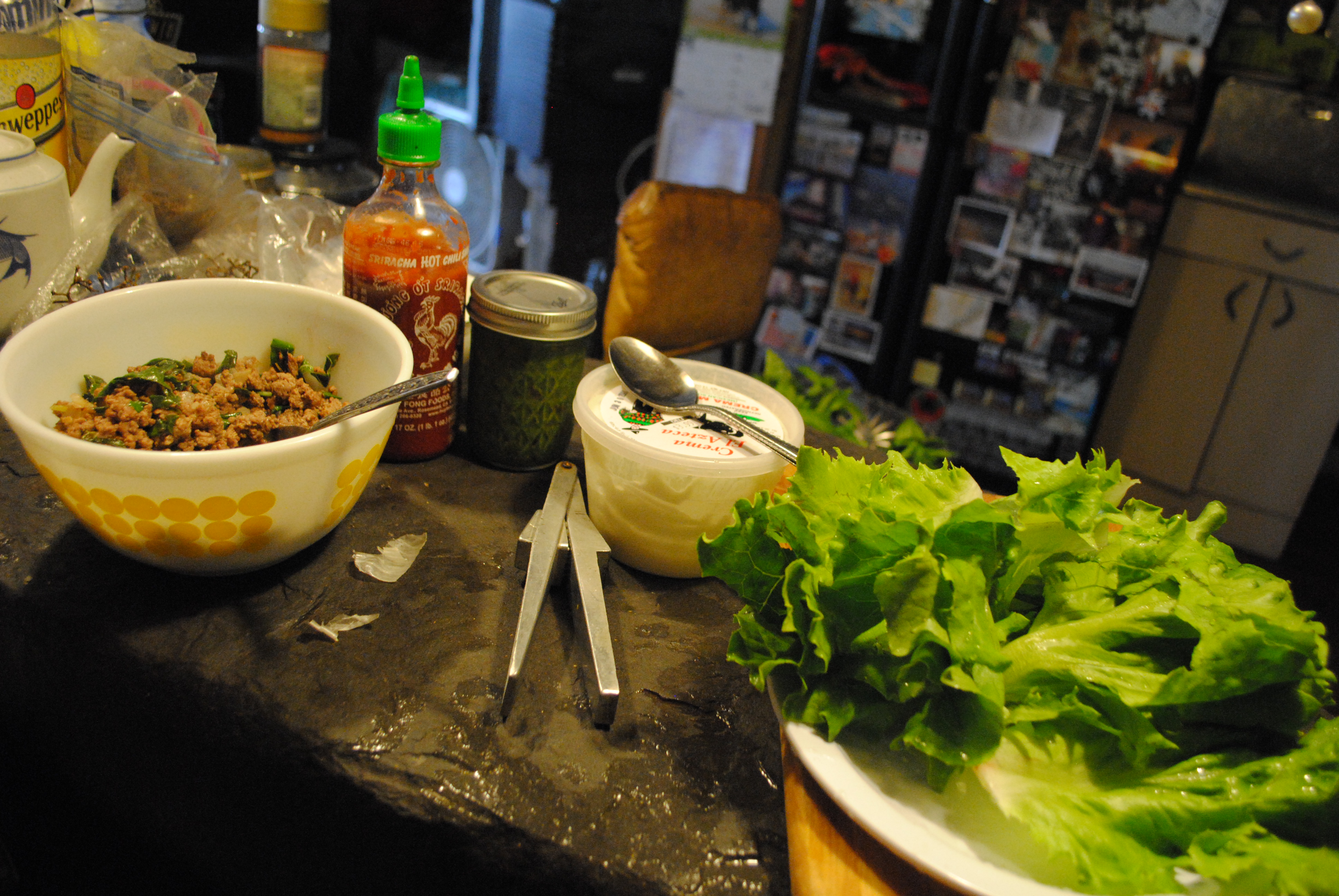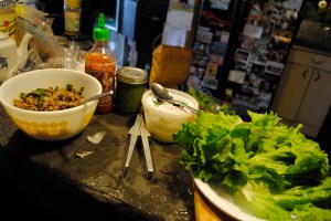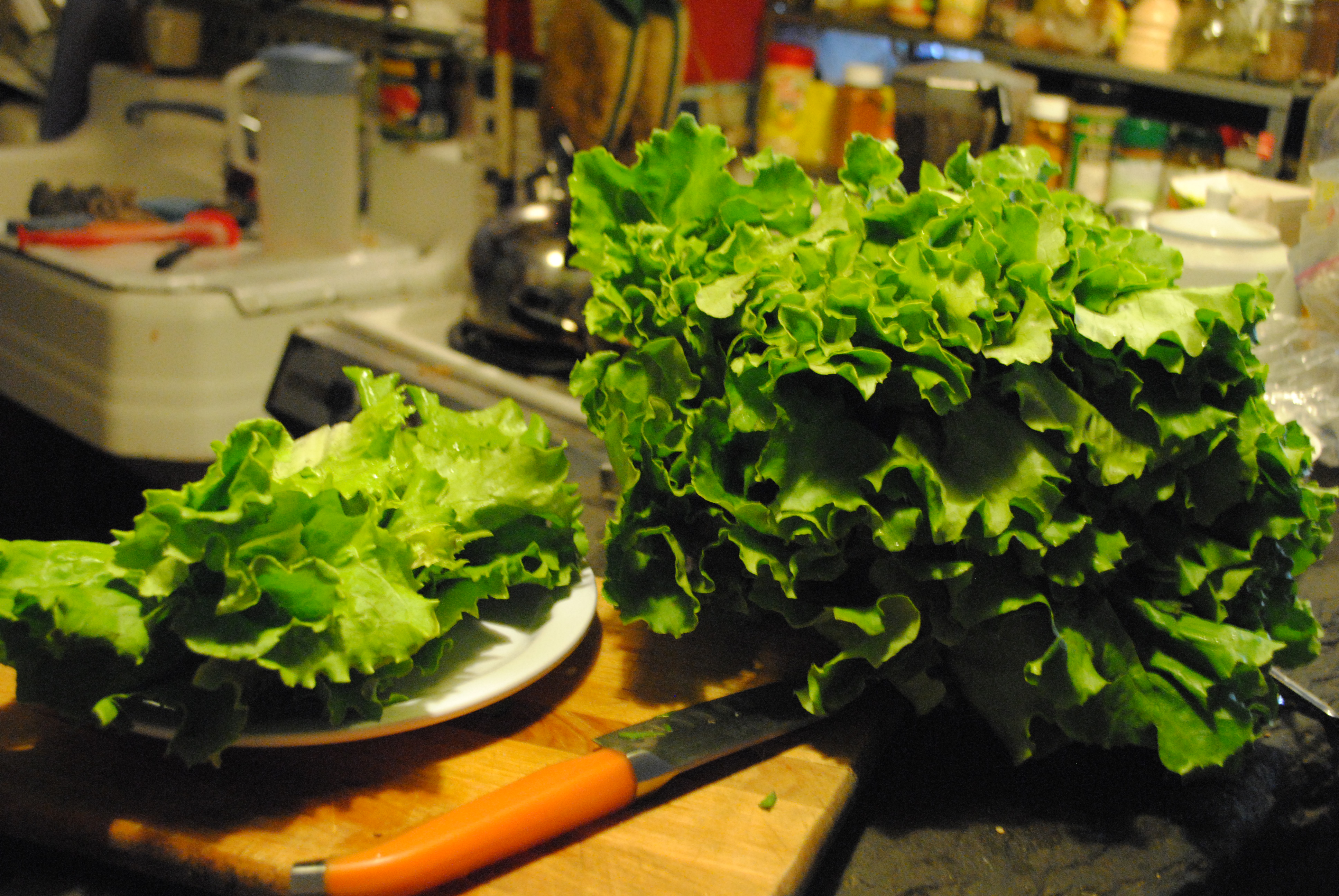 While Gilly loves to rock out salads –themes ranging from traditional to slightly Mexican to meaty–, Yolim is not really a fan of the green salad. This can be difficult when you are a CSA member and receive a ton of lettuce, especially in the beginning of the harvest season. So, what else can you make with lettuce? How about lettuce rolls!