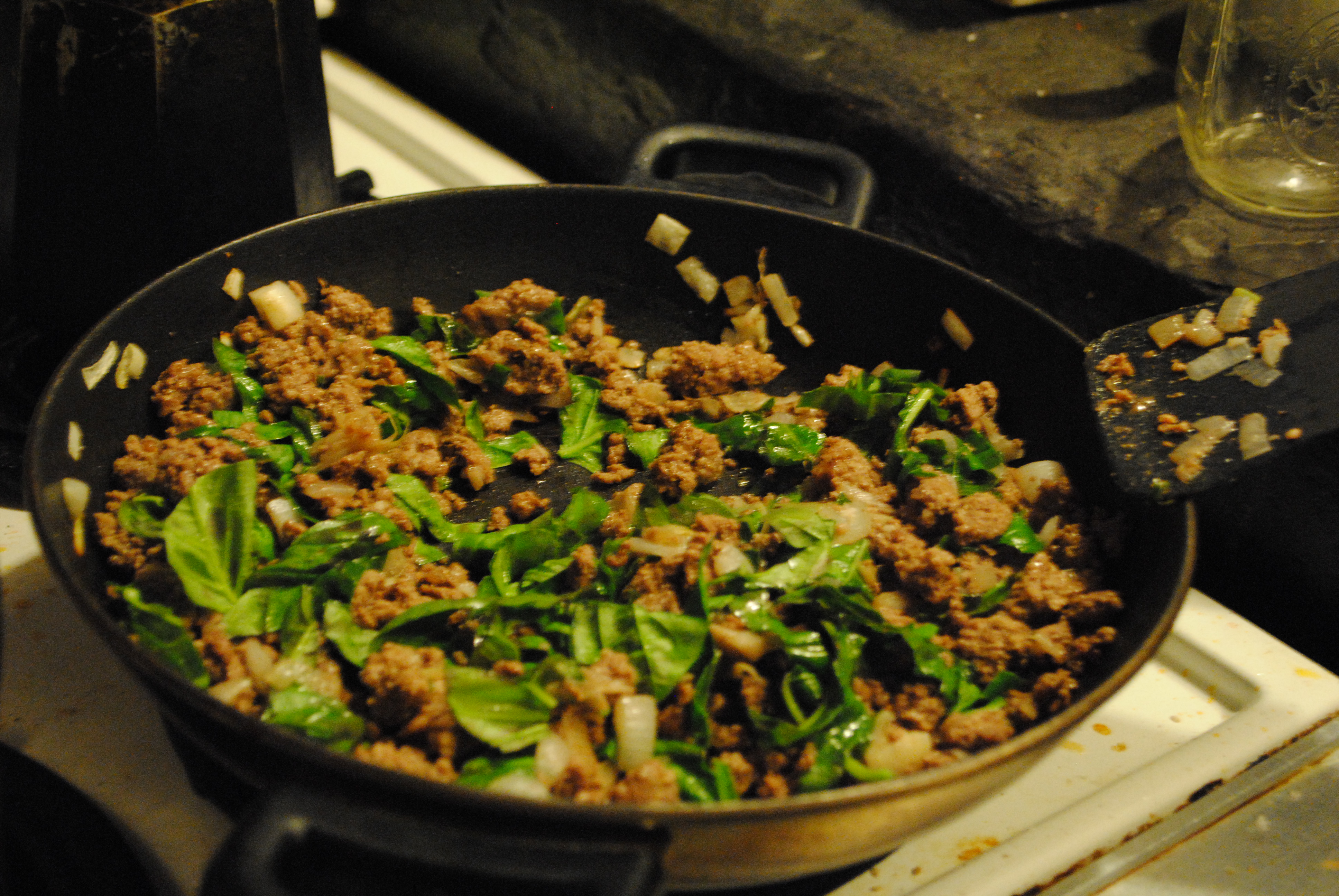 Start first with the filling. We use everything from TVP (aka fake meat) to roasted vegetables to ground meat (beef, pork, or lamb!) in the filling. Seasoned with garlic, onions, and whatever herbs we have in the house, the filling can be versatile, matching your mood or your pantry easily. This time we used our ground