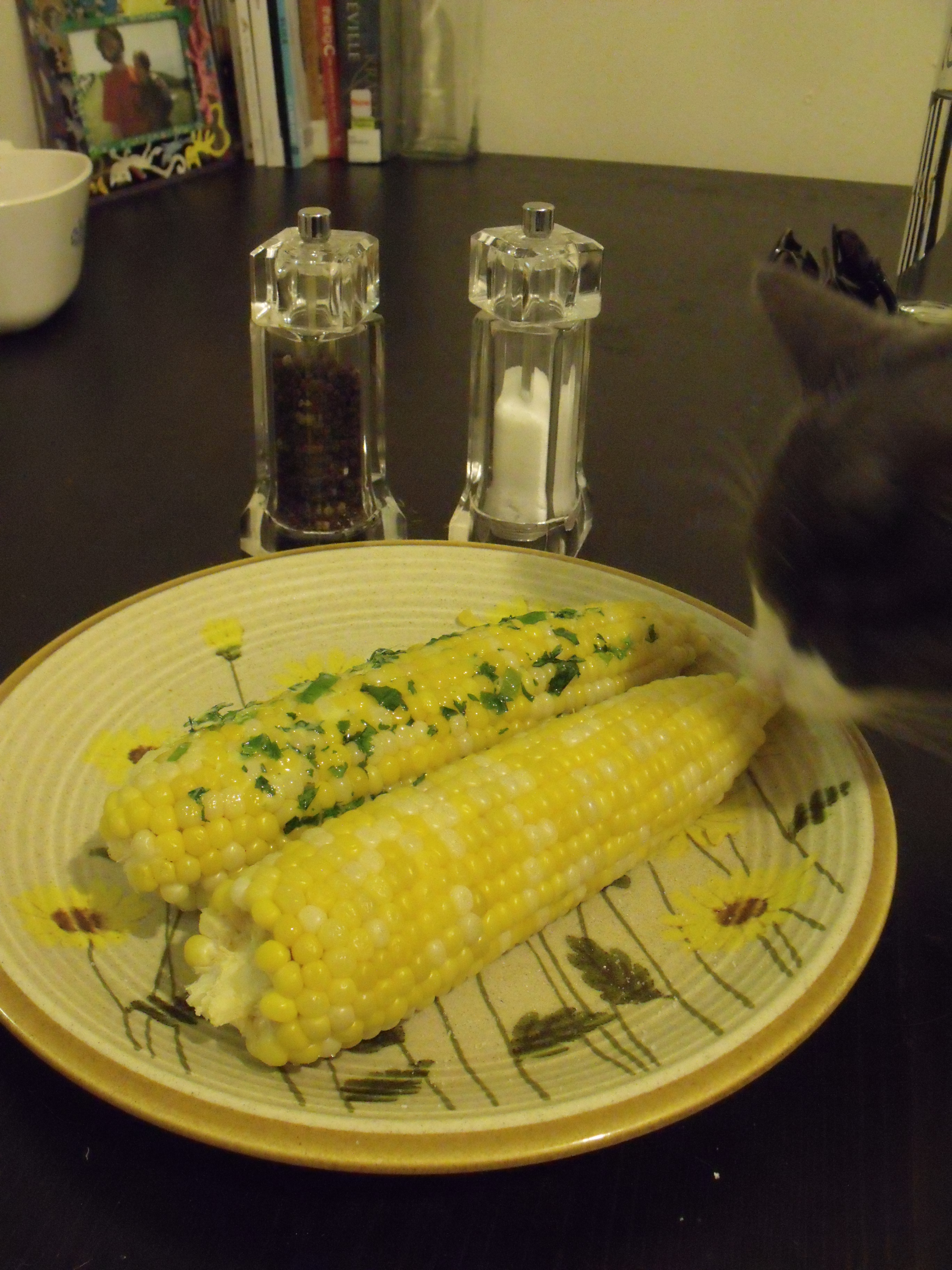 Our share family is Ben, Carrie & Sgt. Snuggles (the furry one above). One of our many important CSA traditions is to immediately consume any and all corn we get. The sugars in corn start turning into starches as soon as you pick it off the stalk, so corn is best the sooner you eat it. We boiled ours for just a couple minutes, between three and four, depending on how attentive we’re being, and then scarfed it down with scallion cilantro butter (easy herbed butter recipe here). We rarely feel the need to do more with the corn than that. It’s just that good.