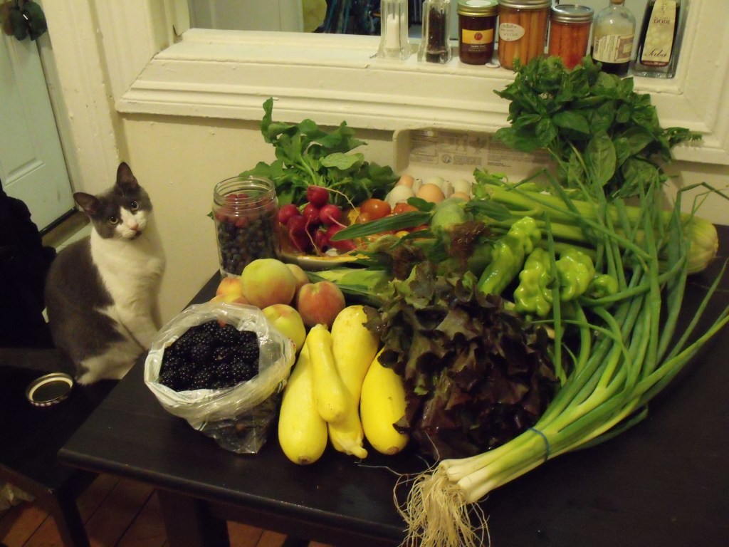 Greetings citizens! We have the domino deluxe, which has treated us very well indeed as we cook just about every day. This week we received, in no particular order, scallions, basil, celery, lettuce, cubanelles, yellow squash, radishes, tomatoes, corn, plums, peaches, blackberries, & eggs.