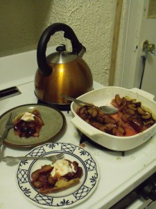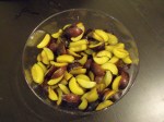Then we threw them in the crust–the recipe called for placing each one, but my patience (low) and excitement for dessert (high) scuttled that plan pretty quickly. A nice thing about galettes: you can put anything in them! They can go sweet or savory and are super forgiving. I did a really awful job making this crust, for example. It was flimsy and crumbly and I was worried it would fall apart and leak delicious plum juice all over. So I just plopped the whole thing in a casserole and baked it that way. Certainly not a traditional galette, but just as delicious. We served it with a dollop of creme fraiche.