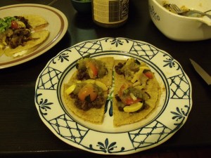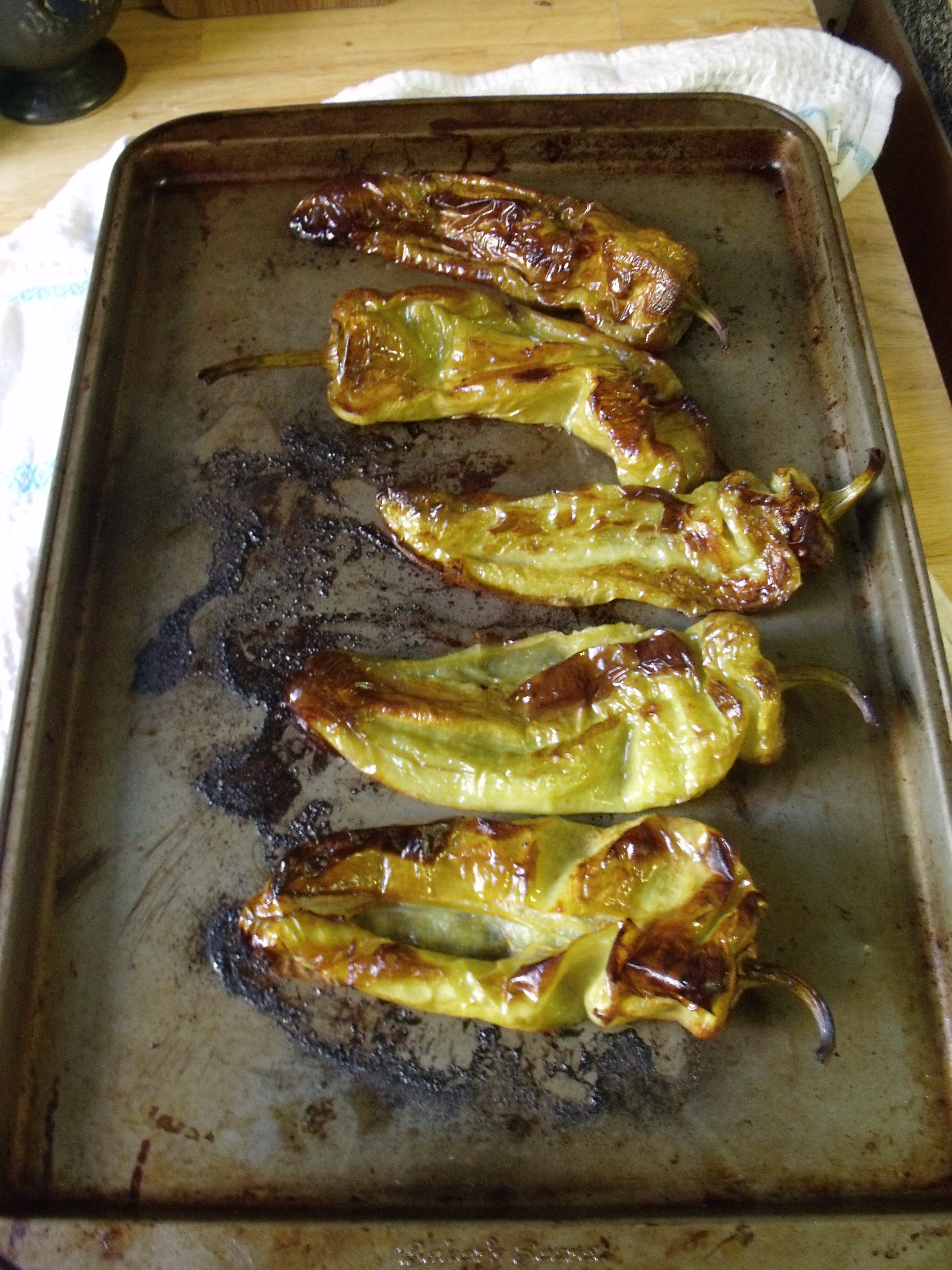 This technique makes the meals that use the most ingredients the most satisfying. Thus, with no further ado, taco night in which we used squash, cubanelles, basil, tomatoes, scallions, & cilantro & onion (from last week). First thing was to roast the cubanelles, which makes them smoky and brings out the sweetness. We coated them with a bit of olive oil and baked them at 450 for between 20 and 30 minutes. Meanwhile, the black beans (soaked since that morning) were simmering with a couple leaves of epazote (frozen from the last time we got it) and I got to prepping the summer squash, onions, basil, & tomatoes. We tossed those all together and cooked them for a few minutes with some homemade veggie stock (just til the squash was tender but not squishy). Once the cubanelles were roasted we let them cool for a couple minutes and then peeled the skins off. Then into the bean pot they went.